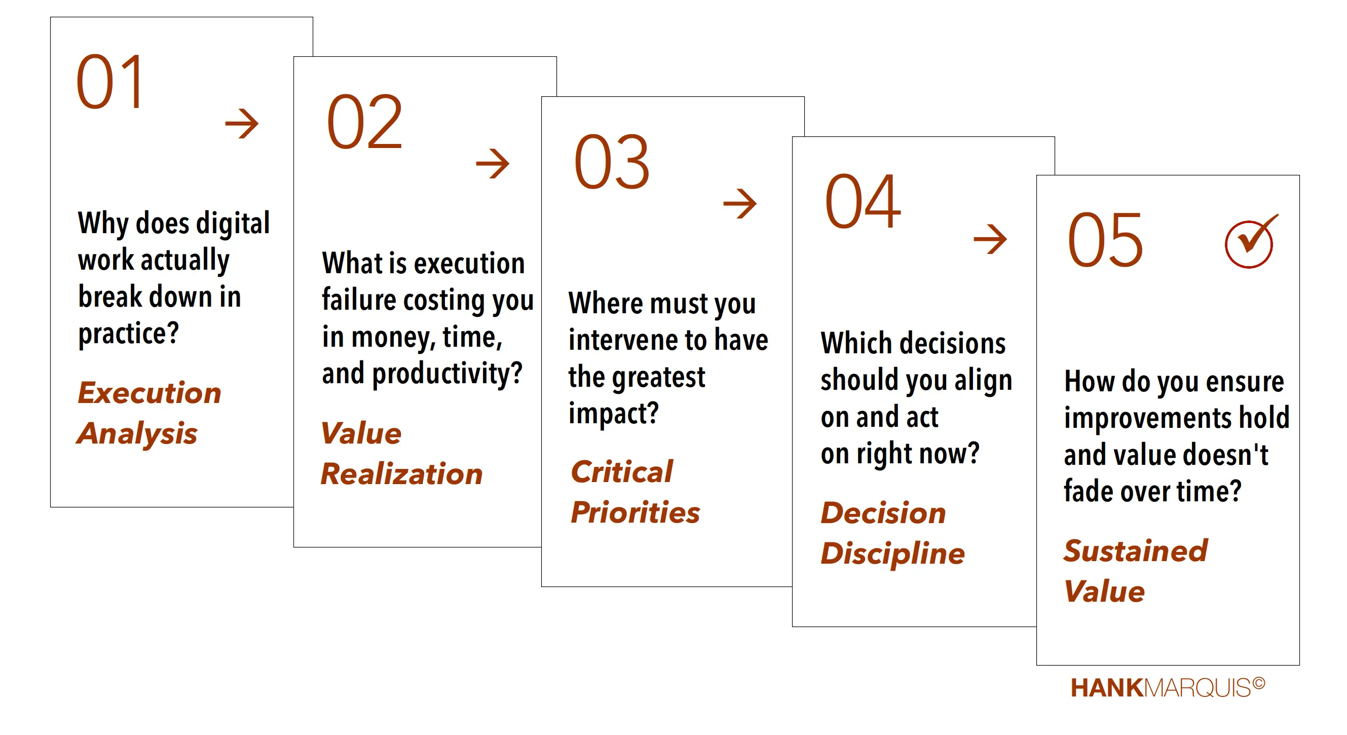 | 03 | Critical priorities show where leaders must intervene. Hailee isolates the specific strategy, design, transition, and operational breakdowns that drive repeated execution failure so leadership knows exactly where change will have the greatest impact. |